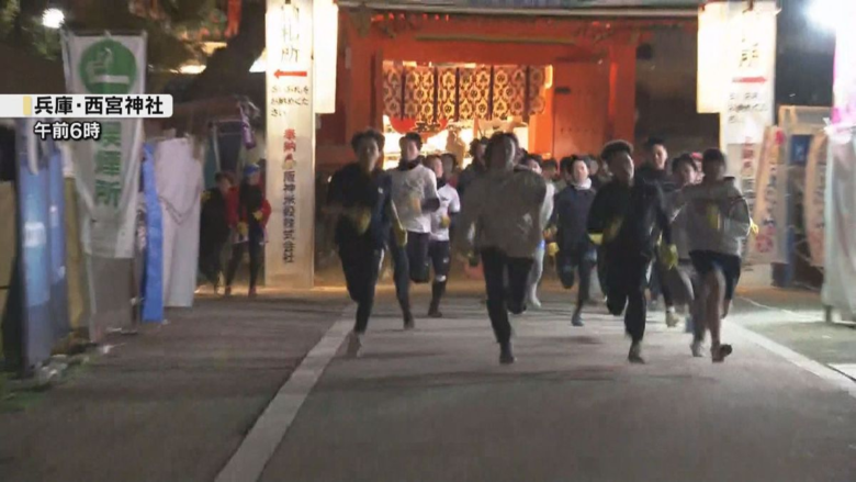 当日は未明から多数の人が表大門の前に集合し、午前6時の開門と共に230メートル先の本殿を目指して駆け出す。そして3着までにゴールした人間(待ち構えている神主に抱きつくことが条件になる)が、その年の福男となる。なお、福男といいながらこの祭事は男女混合であり、老若男女を問わず走ることが出来る。しかし、女性の一番福は未だに出現していない。参加者は毎年2000人以上で、特に2009年以降は約6000人が参加している。コースには3箇所のカーブ(天秤・楠両コーナー等)と本殿に駆け上がる木の坂(スリップ坂)が大きな障害としてあり、毎年のテレビ取材ではこの4箇所を中心に大小のカメラを設置している。開門時の押し合い・スタートダッシュの出来、猛スピードで駆け抜けるためカーブや最後の坂で転倒する者もおり、上手くスピードを制御出来た者が一番福 – 三番福の栄誉を獲得出来るといえる。